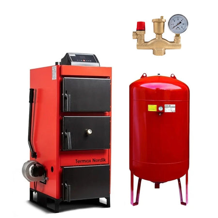 Pachet centrala/Cazan pe lemn/carbune Termax Nordik 70 kW cu ventilator si automatizare, Ø cos fum 180 mm, volum manta apa 130 litri, 3 bar, 1480 x 910 x 625 mm, Grup Siguranta, Vas Expansiune