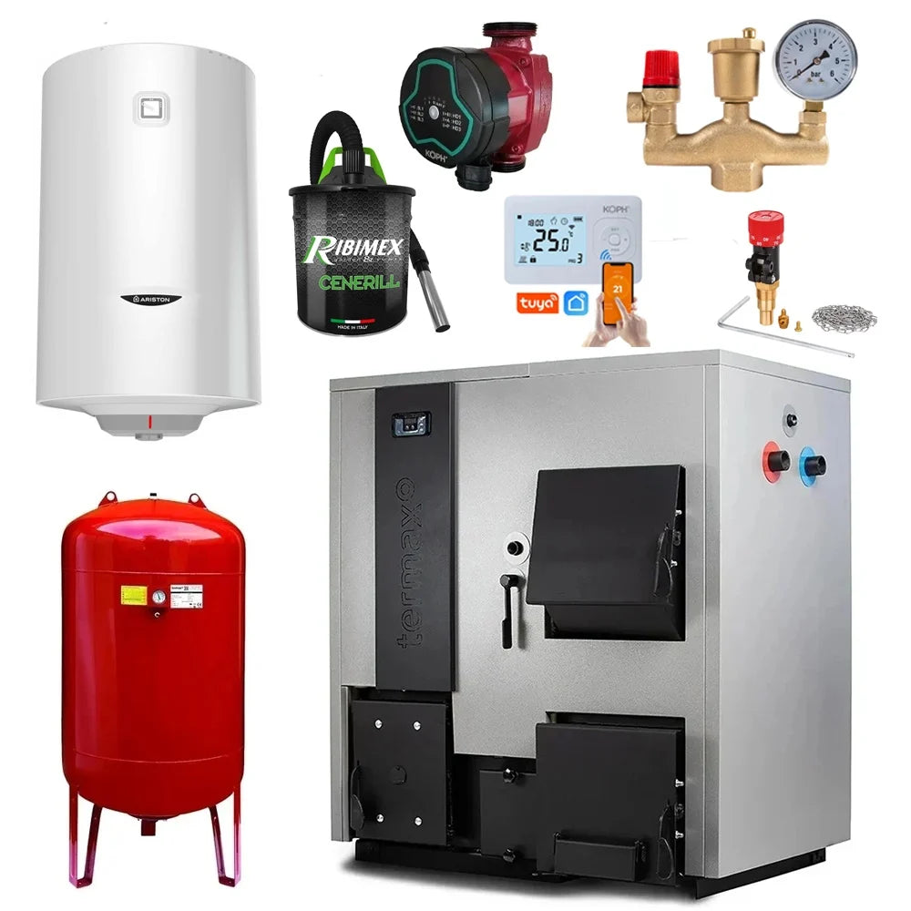 Pachet centrala mixta lemn/pelet Termax Combo 35 kW, volum manta apa 122 litri, Vas expansiune, Termostat inteligent KOPH I302, Pompa recirculare, Boiler termoelectric Ariston 100 litri