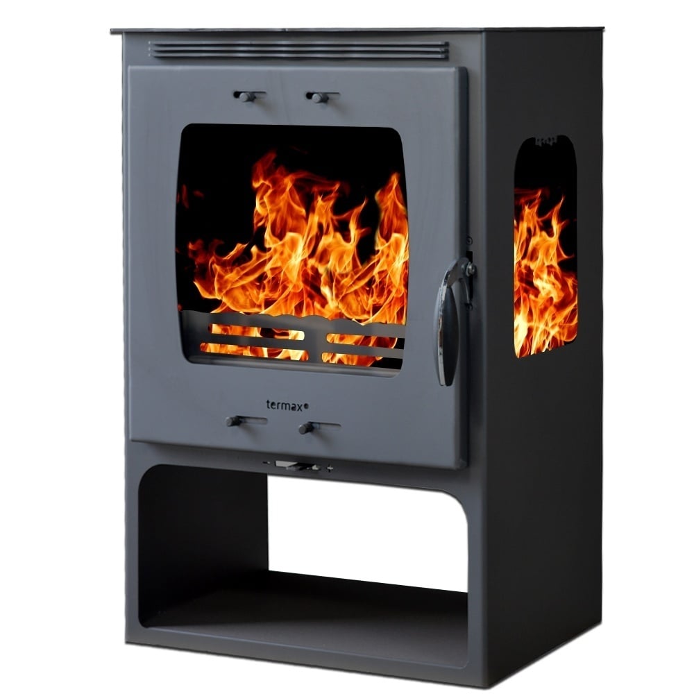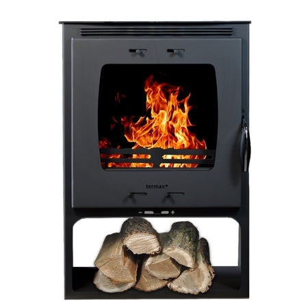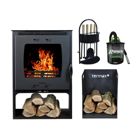 Pachet soba pe lemn Termax Atria, 12.2 kW, randament 84.17%, 80 m², Negru, set accesorii, aspirator cenusa si suport lemne foc metalic Termax M