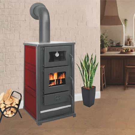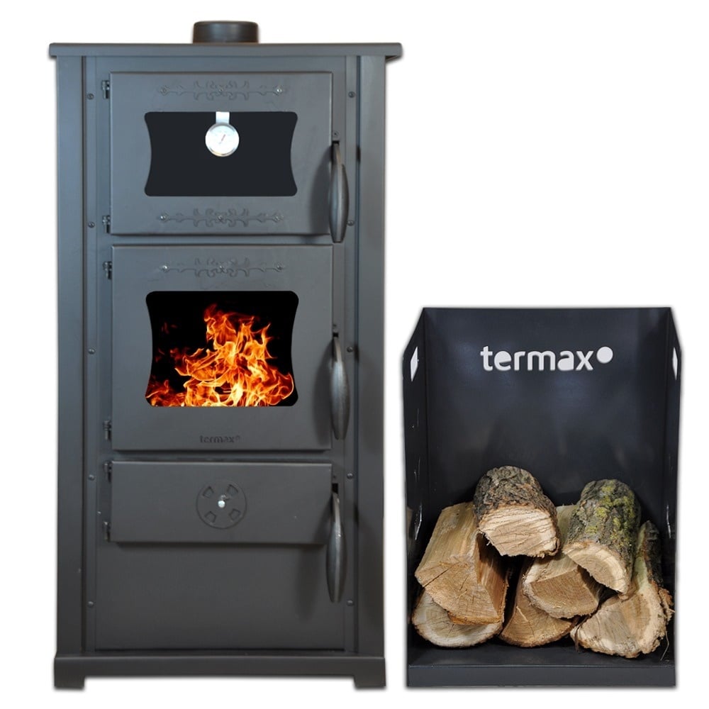 Pachet soba pe lemn Termax Bucovina, 12.2 kW, cuptor incorporat, randament 84.17%, 80 m², Bordo si suport lemne foc metalic Termax M cu design vertical si robust, 50 x 40 x 36 cm