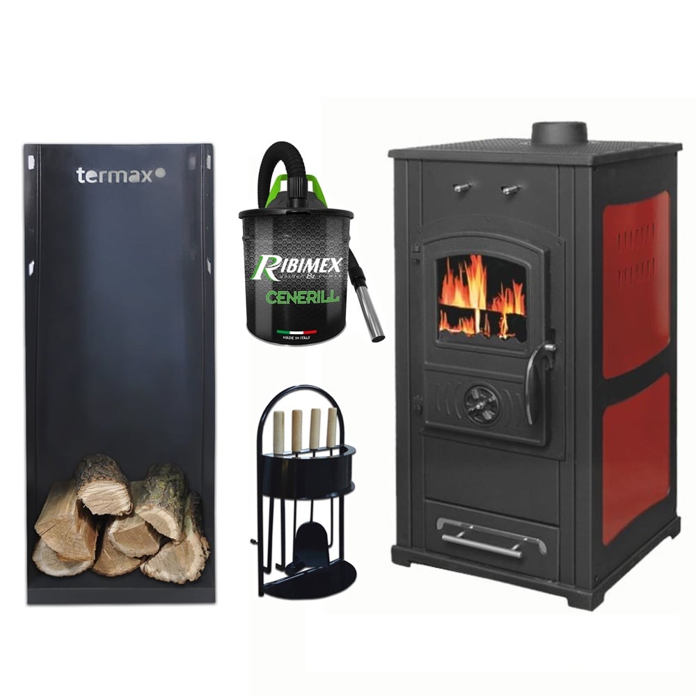 Pachet soba pe lemn Termax Bunica, 8.45 kW, randament 80.36%, 55 m², Bordo, set accesorii, aspirator cenusa si suport lemne foc metalic Termax XL