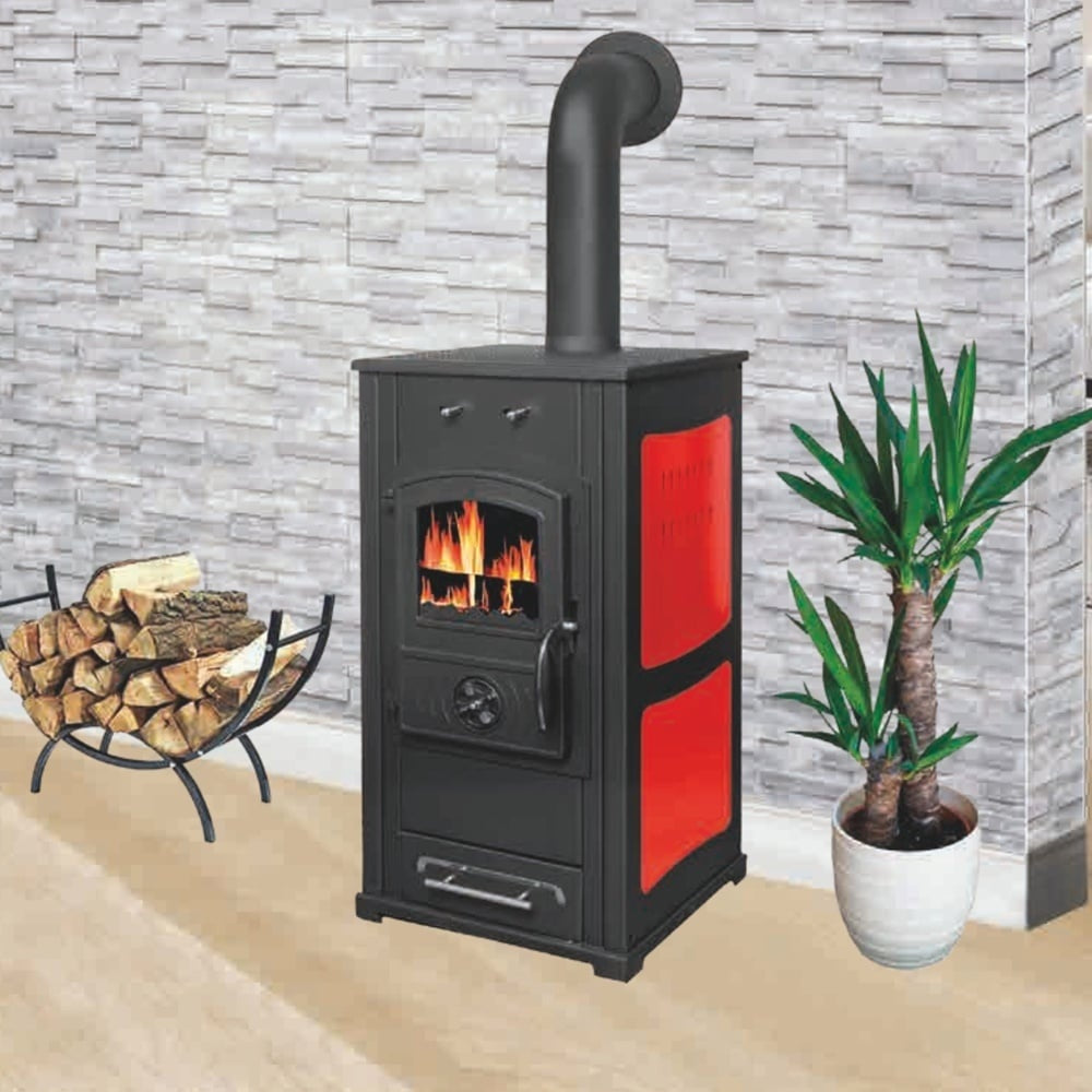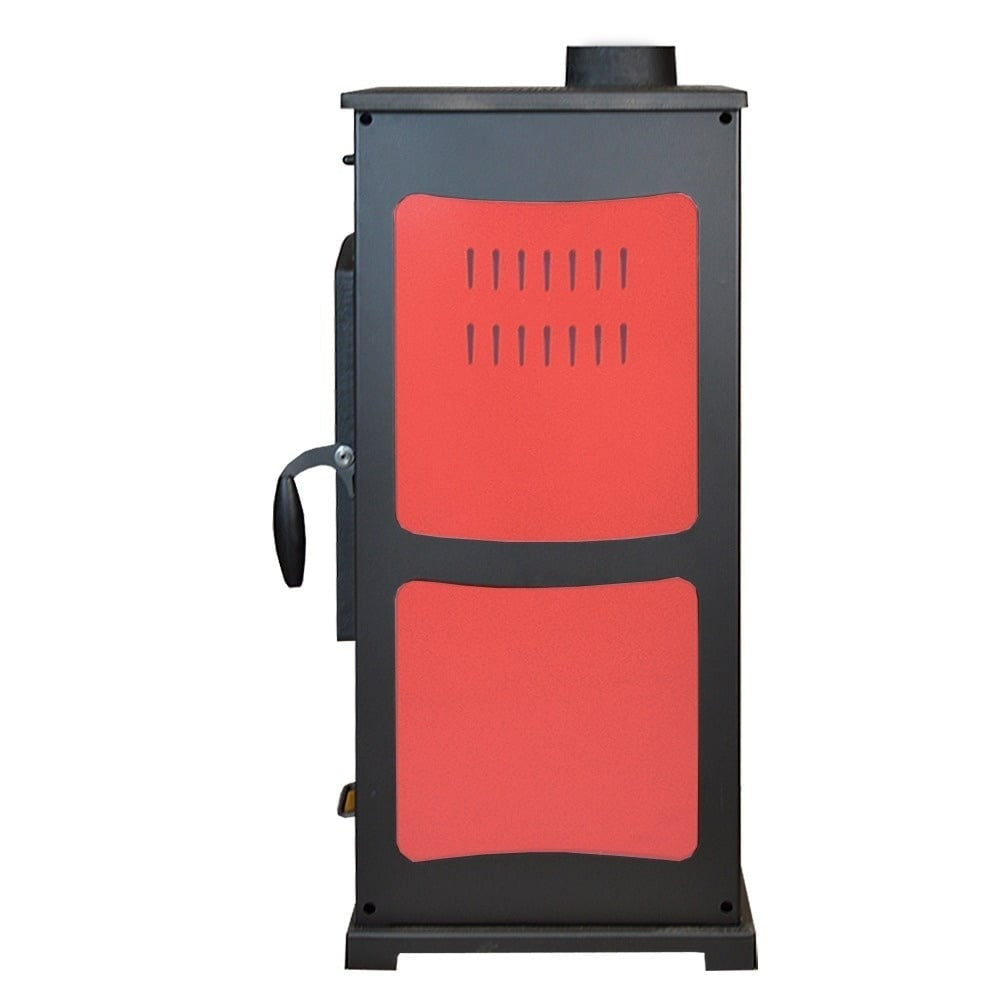 Pachet Soba pe lemn Termax Bunica, 8.45 kW, randament 80.36%, 55 m², Rosu si suport lemne foc metalic Termax M cu design vertical si robust, 50 x 40 x 36 cm