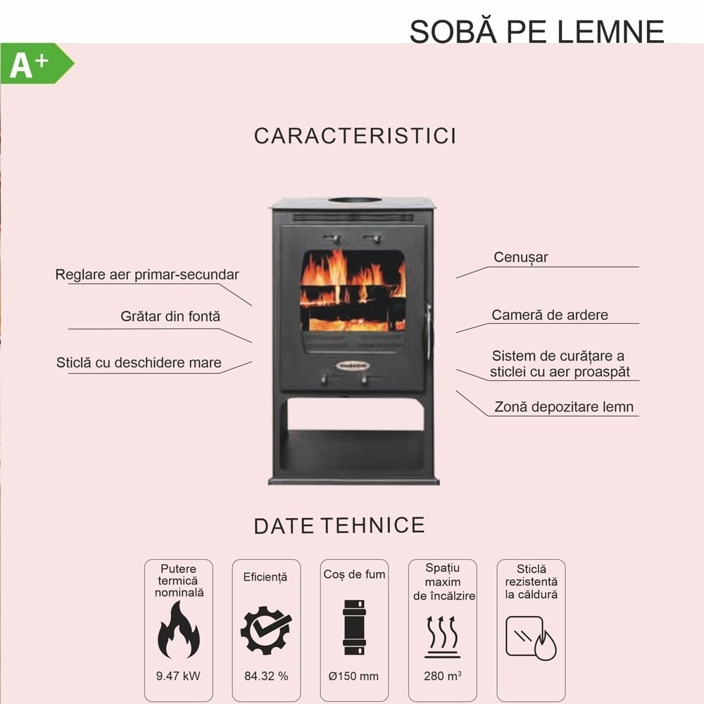Cu o putere nominala de 9.47 kW si o eficienta de 84.32%, este ideala pentru incalzirea incaperilor de pana la 60 m². Soba este echipata cu un gratar turnat, geam larg pe usa, ceea ce permite o experienta vizuala completa a flacarii.