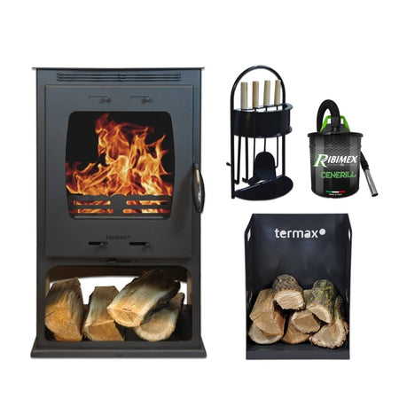 Pachet soba pe lemn Termax Elan, 9.47 kW, randament 84.32%, 60 m², Negru, set accesorii, aspirator cenusa si suport lemne foc metalic Termax M