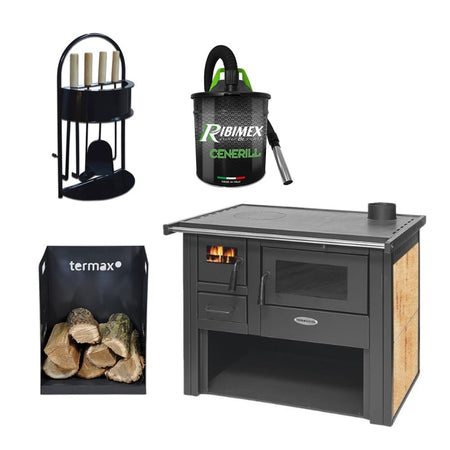 Pachet soba pe lemn Termax Nobil, 7.12 kW, evacuare pe dreapta, cuptor integrat, randament 81.27%, 47 m², Bej, set accesorii, aspirator cenusa si suport lemne foc metalic Termax M