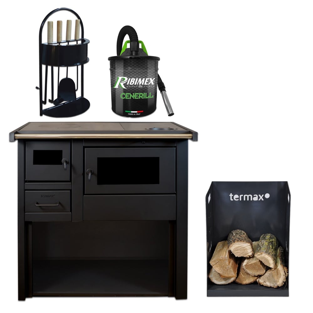 Pachet soba pe lemn Termax Popular, 7.12 kW, evacuare pe dreapta, cuptor integrat, randament 81.27%, 47 m², Negru, set accesorii, aspirator cenusa si suport lemne foc metalic Termax M
