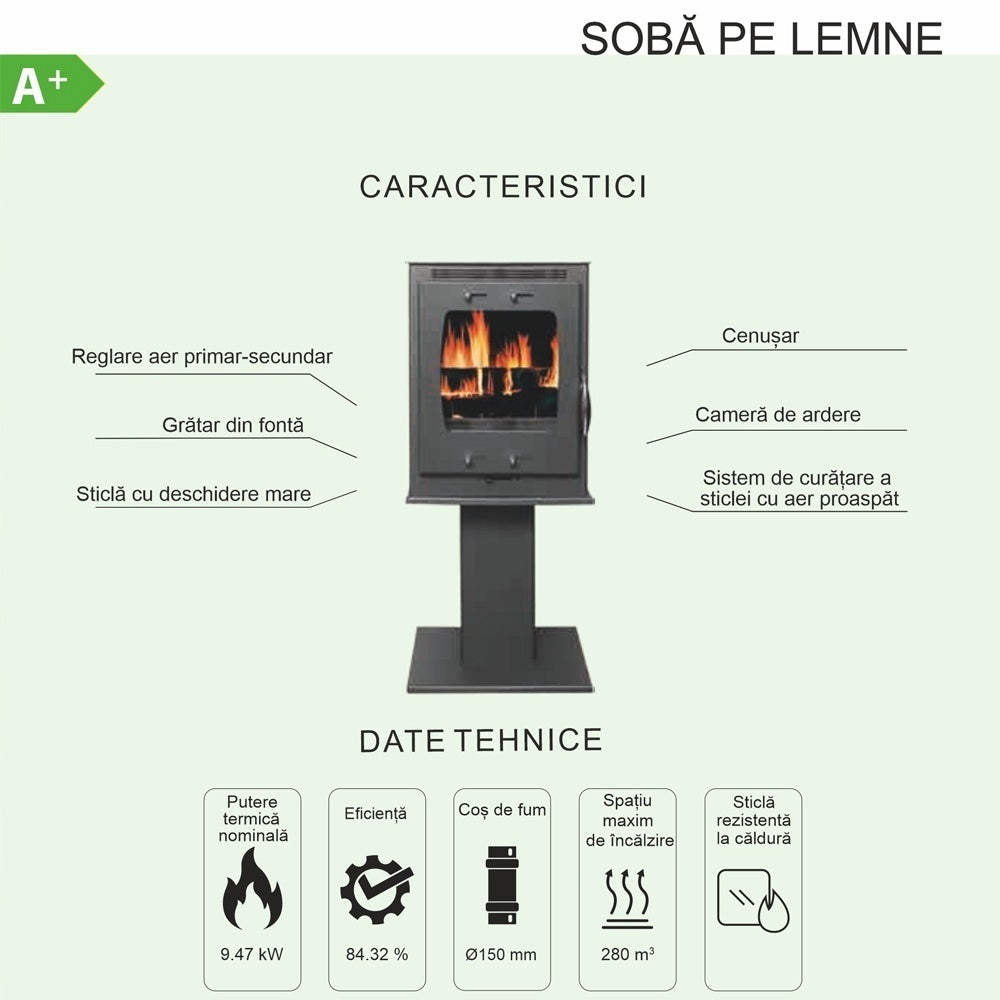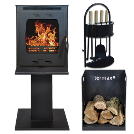 Pachet soba pe lemn Termax Vesta cu picior, 9.47 kW, randament 84.32%, 60 m², set accesorii, Termax si suport lemne foc metalic Termax M