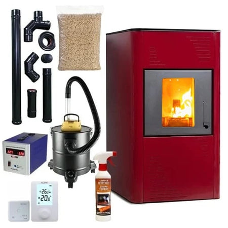 Pachet termosemineu cu peleti Termax Kamin PM 15 kW, 120 mp, buncar peleti 30 kg, volum apa 30 litri, diametru cos fum ⌀80 mm, vas expansiune si pompa recirculare incluse, Bordo