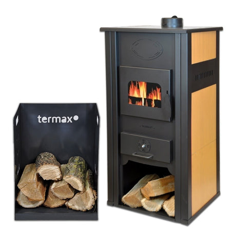 Pachet termosemineu pe lemn Termax Thermis, 24.43 kW, randament 85.10%, 155 m², Bej si suport lemne foc metalic Termax M cu design vertical si robust, 50 x 40 x 36 cm