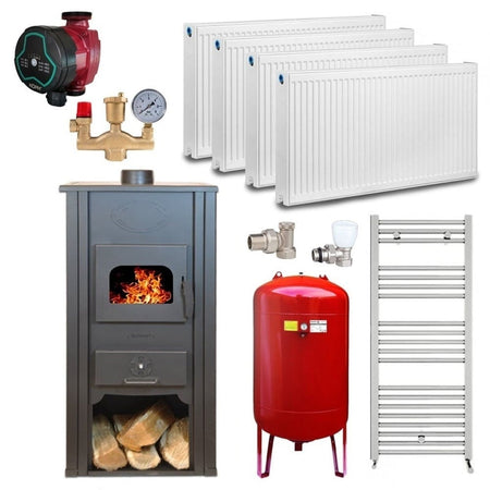 Pachet Termosemineu pe lemn Termax Thermis, 24.43 kW, randament 85.10%, 155 m², Calorifere, Pompa Recirculare, Grup siguranta, Vas expansiune, Robineti tur/retur