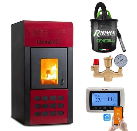 Pachet Termosemineu pe peleti Termax Kamin ECO, 25 kW, 160 mp, buncar peleti 45 kg, volum apa 42 litri, diametru cos fum ⌀80 mm, vas expansiune si pompa recirculare incluse, Termostat inteligent KOPH CT99, Grup de siguranta, Aspirator cenusa