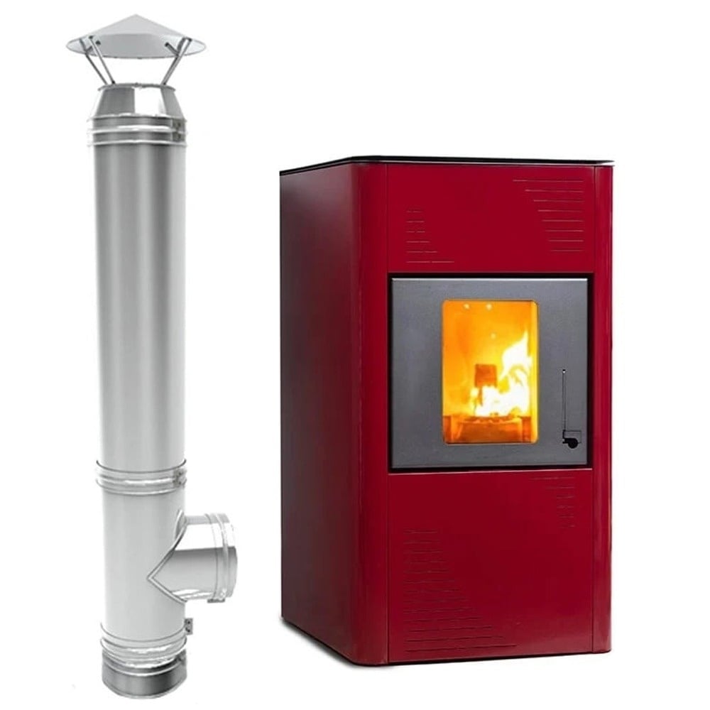Pachet Termosemineu pe peleti Termax Kamin PM 15 kW, 120 mp, buncar peleti 30 kg, volum apa 30 litri, diametru cos ⌀80 mm, vas expansiune, pompa recirculare incluse si cos de fum din inox cu dublu perete, inaltime 4 metri, diametru interior ⌀80 mm
