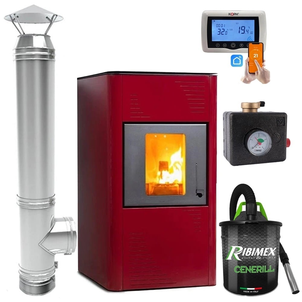 Pachet Termosemineu pe peleti Termax Kamin PM 15 kW, vas expansiune, pompa recirculare incluse si cos de fum din inox cu dublu perete, inaltime 4 metri, diametru interior ⌀80 mm, Grup de siguranta, Termostat inteligent KOPH CT99, Aspirator cenusa