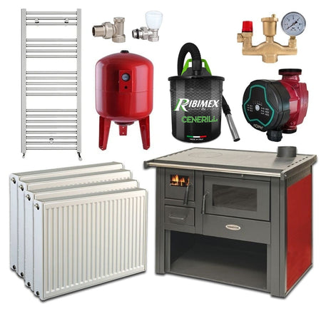 Pachet Termosoba pe lemn Termax Culina, 12.05 kW, evacuare pe dreapta, cuptor integrat, randament 85.29%, 80 m², Calorifere, Pompa Recirculare, Grup siguranta, Vas expansiune, Robineti tur/retur