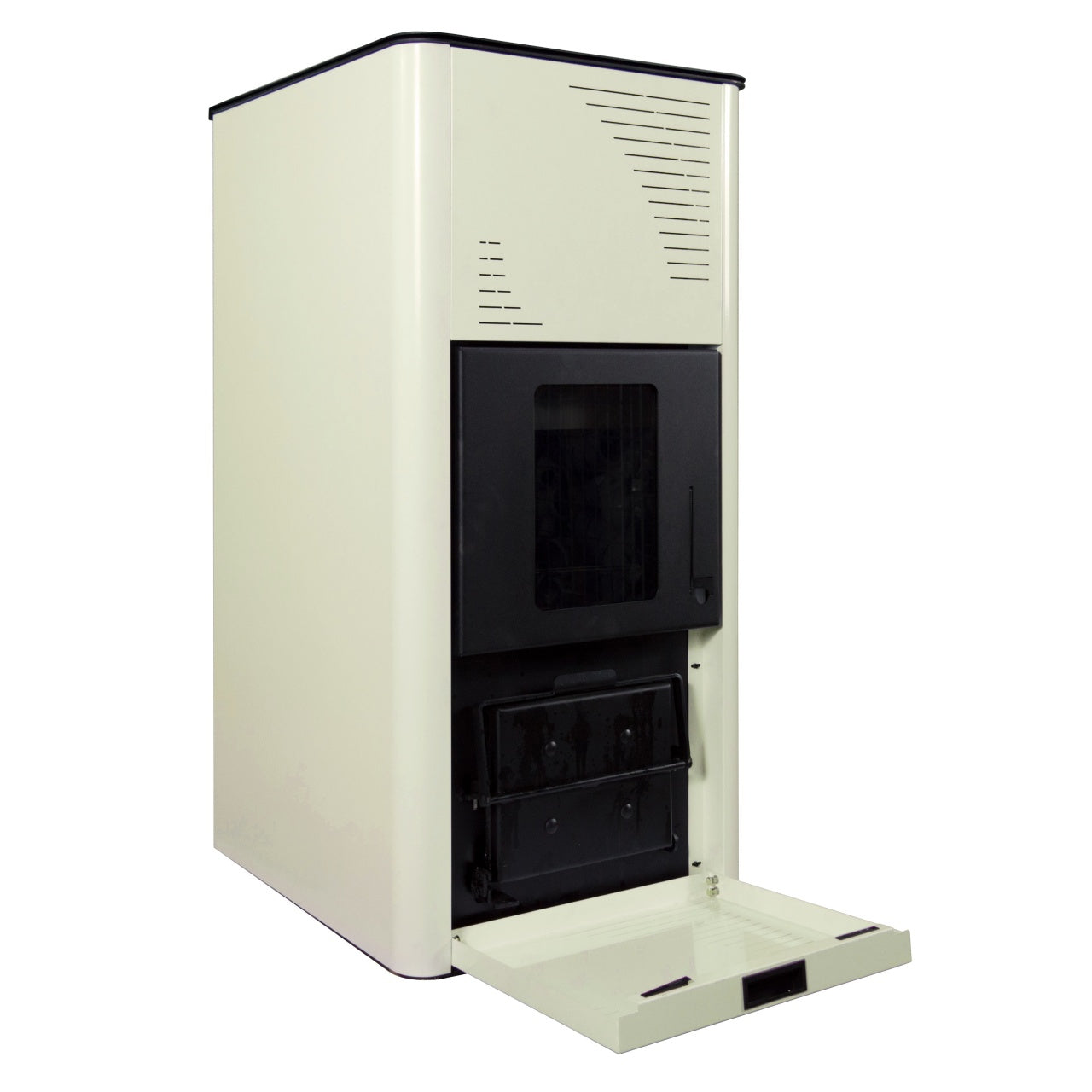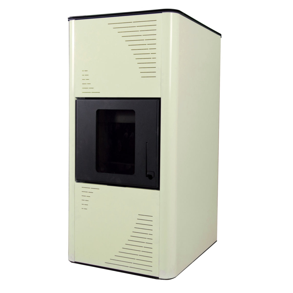 Termosemineu pe peleti Termax Kamin PM 15 kW, 120 mp, buncar peleti 30 kg, volum apa 30 litri, diametru cos fum ⌀80 mm, vas expansiune si pompa recirculare incluse, Crem