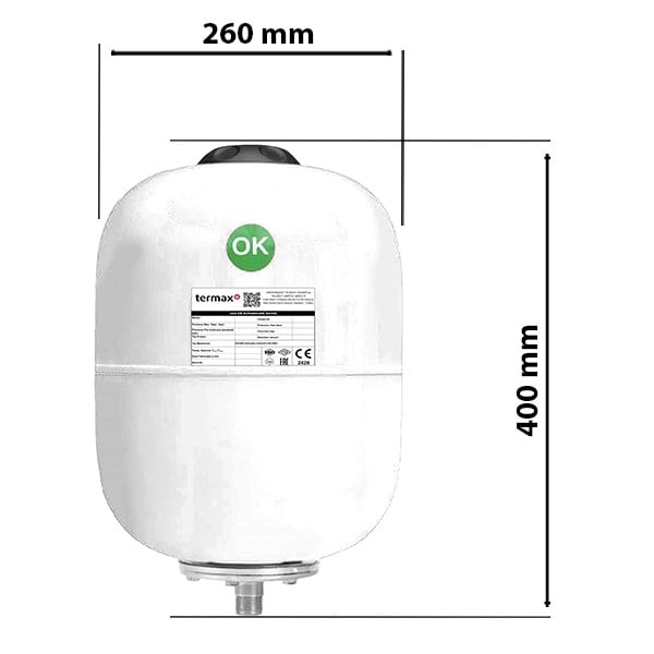Vasul de expansiune Termax cu capacitatea de 18 litri este special creat pentru sistemele solare, capabil sa reziste la presiuni de pana la 10 bar. Echipat cu o membrana EPDM, se ajusteaza eficient la extinderea termica a apei din sistem.